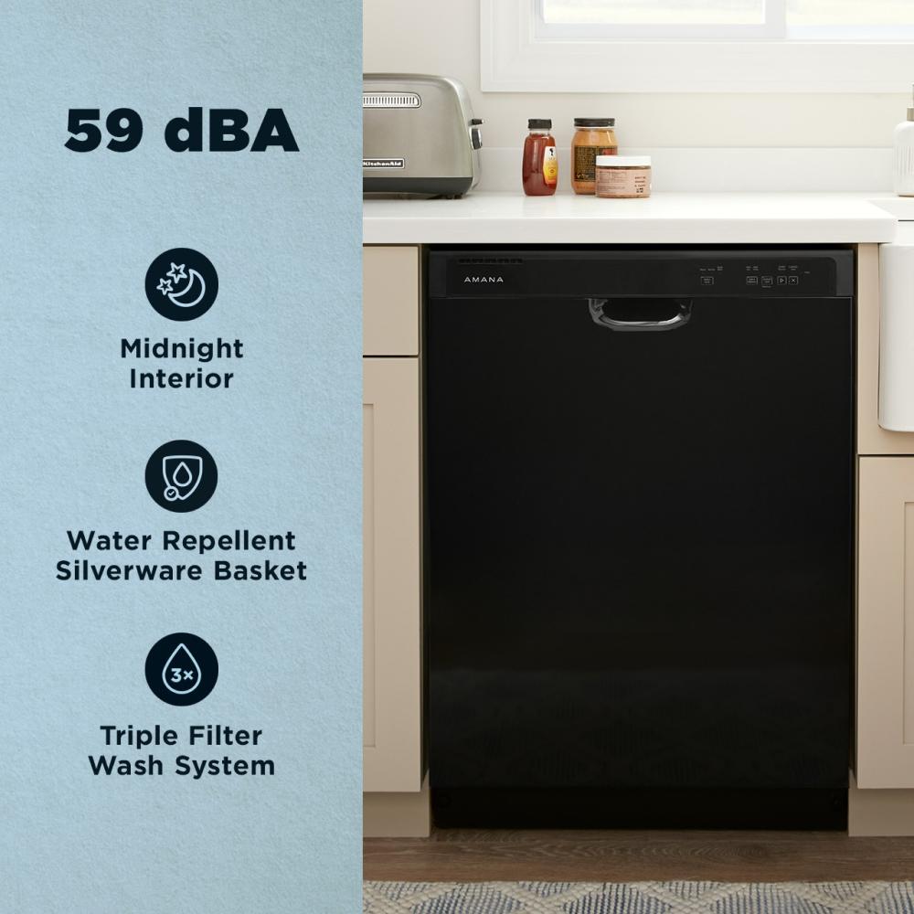 - This Amana® Dishwasher offers a 59 dBA rating so you can clearly hear tonight’s game above the sound of your dishwasher.