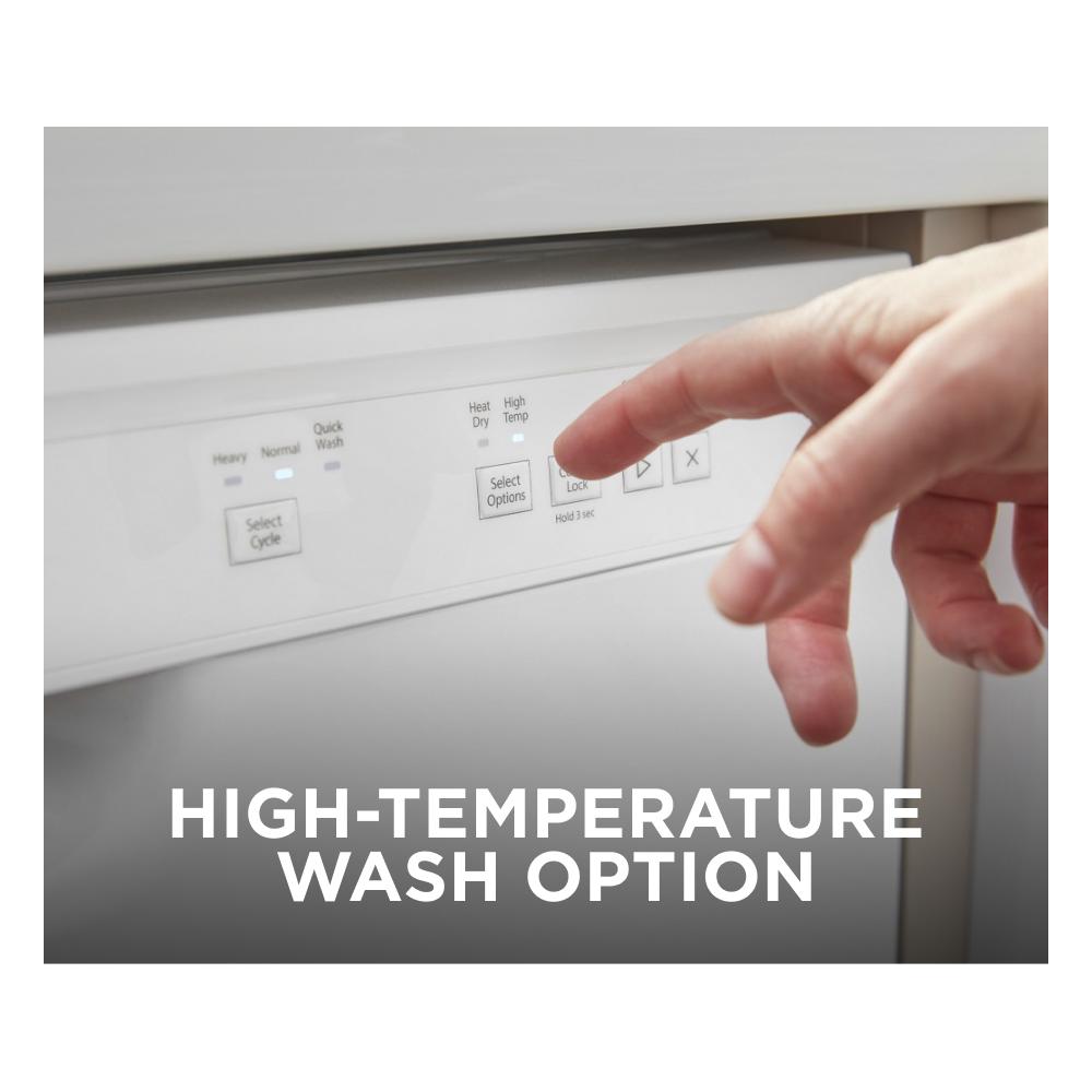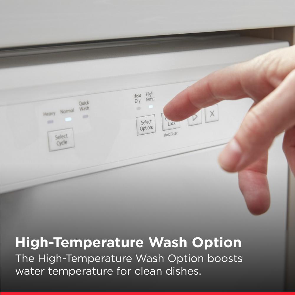 - A heater boosts the water temperature during the wash cycle with the High-Temperature Wash Option. Plus, an extra rinse is added to help get those dishes clean.